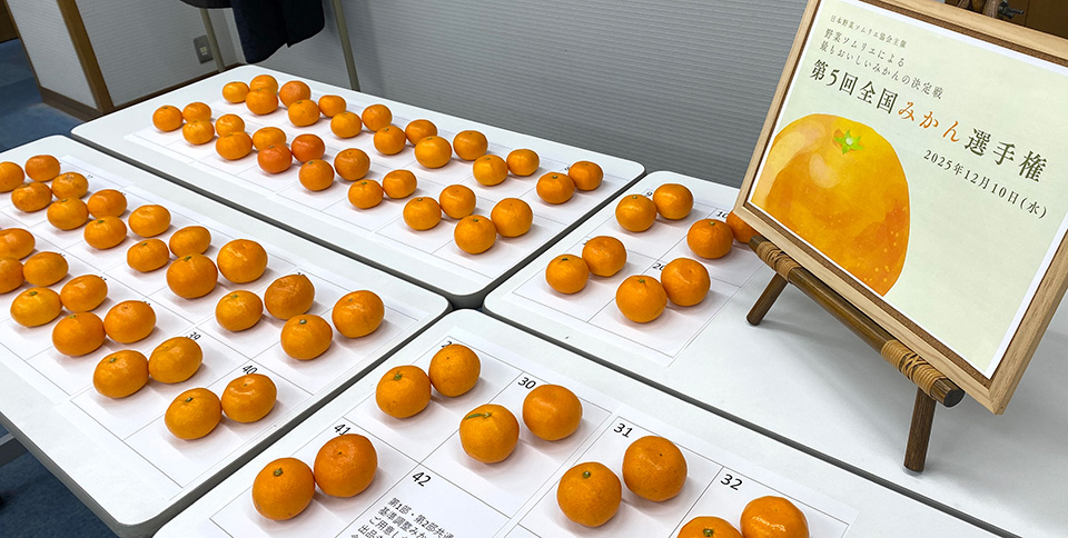 2025年12月10日、大阪会場にて「第5回全国みかん選手権」が実施されました。評価員をつとめたのは野菜ソムリエ有資格者37名。第1部と第2部に分かれ、産地や品種、生産者などの情報をすべて伏せた状態で審査が行われました。