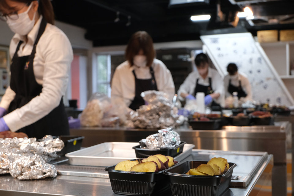 準備風景を覗き見すると、準備担当の野菜ソムリエさんたちが膨大な量の焼き芋を1本1本丁寧に取り扱っていました。