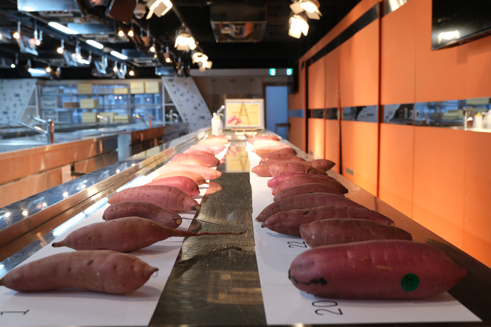 審査終了後に情報が開示され、会場入口には出品されたサツマイモがずらり。生イモの外観は同じように見えても、焼くことで味や食感に異なる個性が出てくるのが焼き芋の奥深さです。